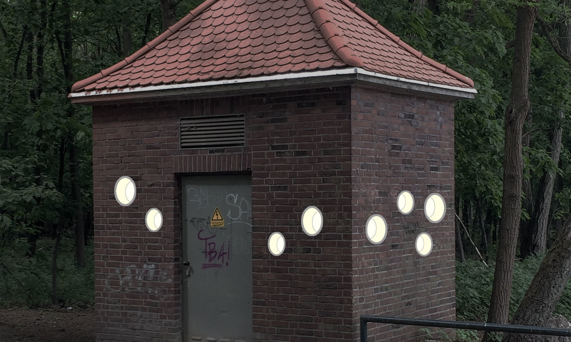Auch in der Abenddämmerung werden Besucher des Trafohauses die Kunst im Innenraum besichtigen können. Die einzelnen mit Glas geschlossenen Okuli werden auf verschiedenen Höhen in die vier Wände gebohrt, so dass die Besucher unterschiedliche Perspektiven einnehmen können und die Plastiken dreidimensional erfahren werden.